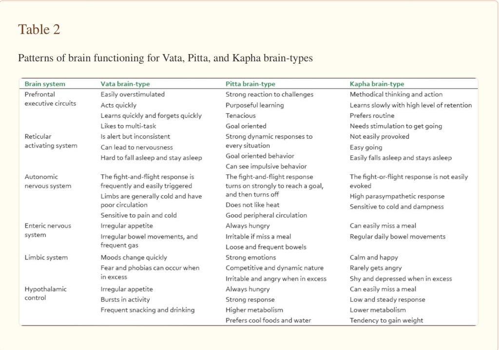 Moreover, additional studies (published on the NCBI) demonstrate that one’s leading dosha is reflected in body physiology. There is actually a tangible difference, neurologically speaking, between each “dominant type”.
